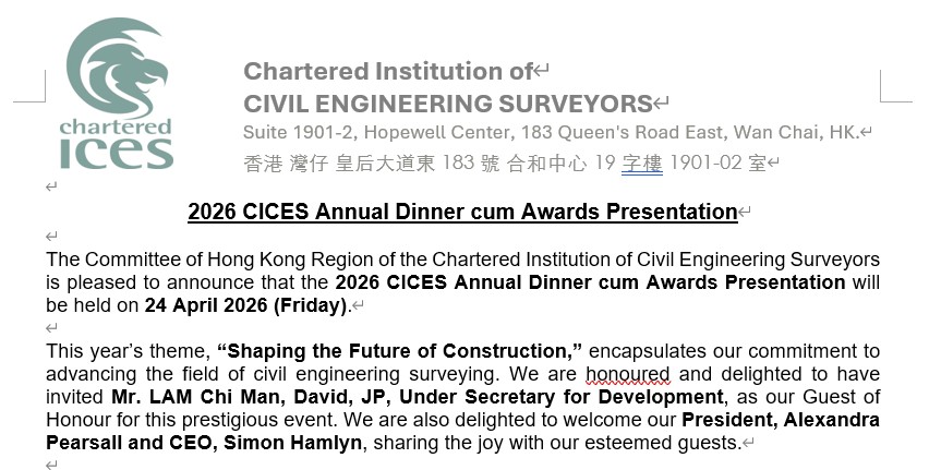 In 2015, Engineering Council approved allowing CICES members to apply for professional registration. Members will be able to apply for the grades of Chartered Engineer (CEng), Incorporated Engineer (IEng) and Engineering Technician (EngTech). This could assist career advancement and provide a passport to opportunities worldwide where ‘Chartered Engineer’ is well recognised and understood. In 2018, we started to accept Chartered Engineer Registration in Hong Kong and thus added value to CICES Membership.